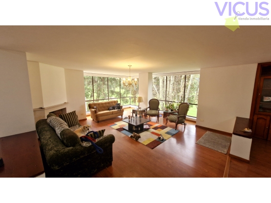 VENTA APARTAMENTO EN LA CALLEJA, Usaquén. esquinera y con excelente vista al campo del Country Club. Piso 4 por ascensor, son 220 m2 y cuenta con espacios separados de sala, comedor y estudio abierto con biblioteca. Chimenea a gas. Cómoda Cocina integral cerrada, muy buen almacenamiento; lavandería independiente, ventilada e iluminada. Sus tres habitaciones con muy buenos espacios y closets, tres baños completos más el baño social. Pisos laminados en general y mármol en corredor. Además, en sótano Parqueadero doble en línea y depósito. Edificio multifamiliar de más de 25 años, con 7 pisos y 14 apartamentos en total. Cuenta con salón social, terraza con parrilla y Vigilancia 24 con CCTV. En zona residencial muy tranquila, acceso a comercio muy variado por la cll 127, y a minutos de supermercados de cadena, centros comerciales, zona de restaurantes, clínicas y amplia gama de servicios médicos y financieros. A minutos de la Avenida 19, autopista, Cll 127 y 134 con excelente transporte público.